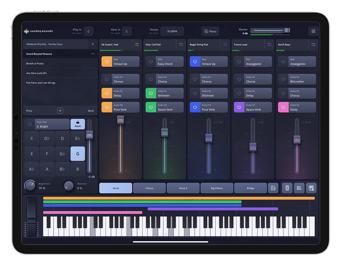 Sunday Keys is an app that makes playing keys at church simple, reliable, and inspiring., with any keyboard! It gives worship players a curated library of modern worship sounds, intuitive workflows for easy prep, and rock‑solid performance tools—without the need for expensive gear or complicated software.